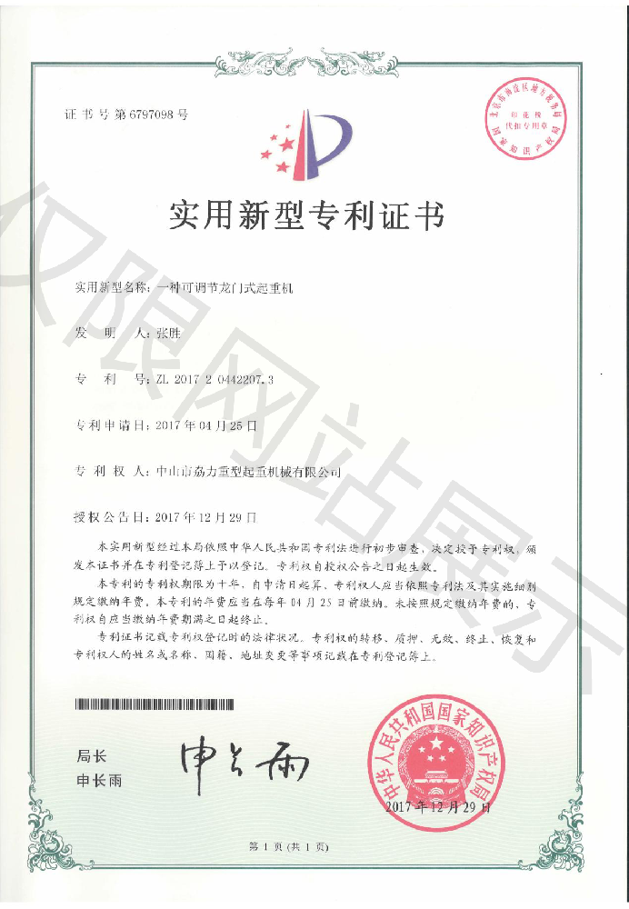 實用新型專利證書 -- 可調節龍門式起重機